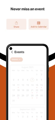 NEVER MISS AN EVENT The event section shows a list of events throughout the district. Users can add an event to their calendar to share the event with friends and family with one tap.